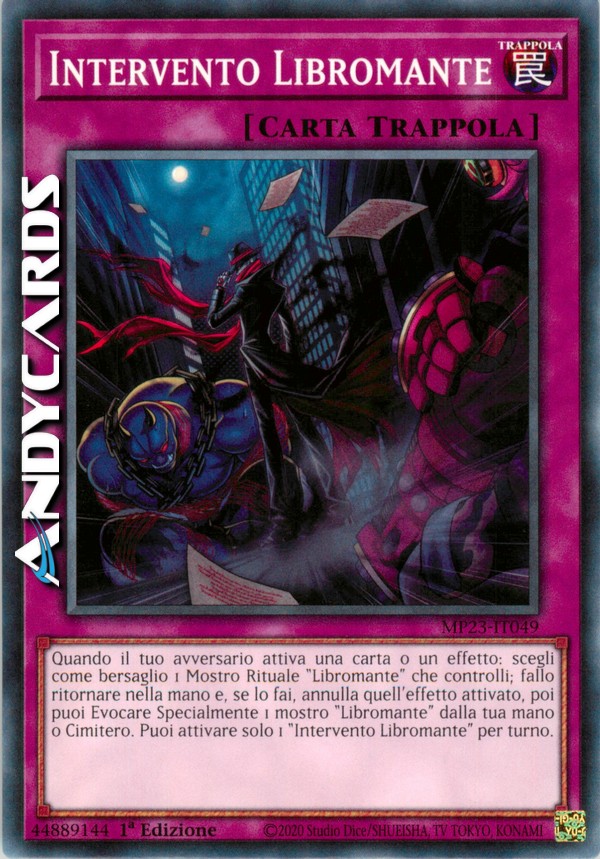 Quando il tuo avversario attiva una carta o un effetto: scegli come bersaglio 1 Mostro Rituale "Libromante" che controlli; fallo ritornare nella mano e, se lo fai, annulla quell'effetto attivato, poi puoi Evocare Specialmente 1 mostro "Libromante" dalla tua mano o Cimitero. Puoi attivare solo 1 "Intervento Libromante" per turno.