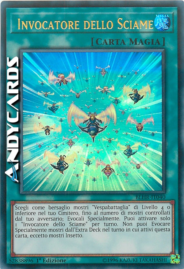 Scegli come bersaglio mostri "Vespabattaglia" di Livello 4 o inferiore nel tuo Cimitero, fino al numero di mostri controllati dal tuo avversario; Evocali Specialmente. Puoi attivare solo 1 "Invocatore dello Sciame" per turno. Non puoi Evocare Specialmente mostri dall'Extra Deck nel turno in cui attivi questa carta, eccetto mostri Insetto.