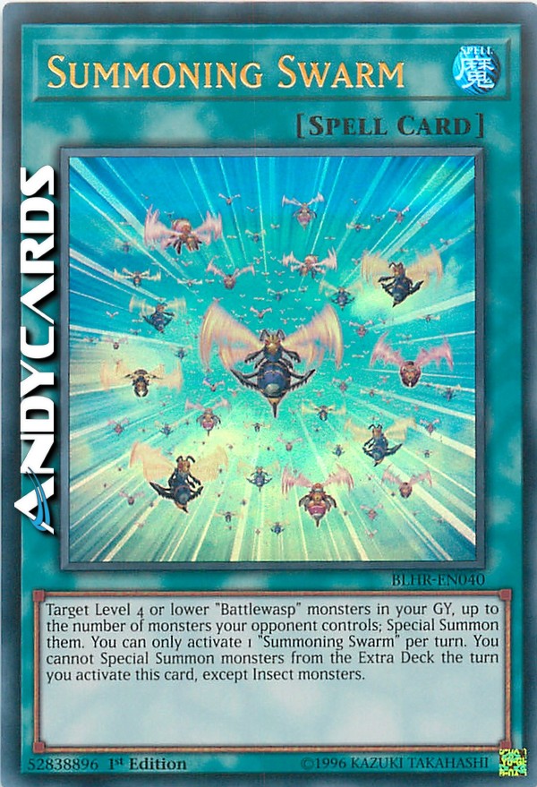 Target Level 4 or lower "Battlewasp" monsters in your GY, up to the number of monsters your opponent controls; Special Summon them. You can only activate 1 "Summoning Swarm" per turn. You cannot Special Summon monsters from the Extra Deck the turn you activate this card, except Insect monsters.