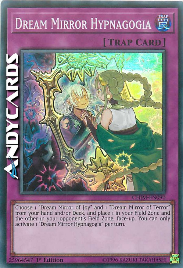 Choose 1 "Dream Mirror of Joy" and 1 "Dream Mirror of Terror" from your hand and/or Deck, and place 1 in your Field Zone and the other in your opponent's Field Zone, face-up. You can only activate 1 "Dream Mirror Hypnagogia" per turn.