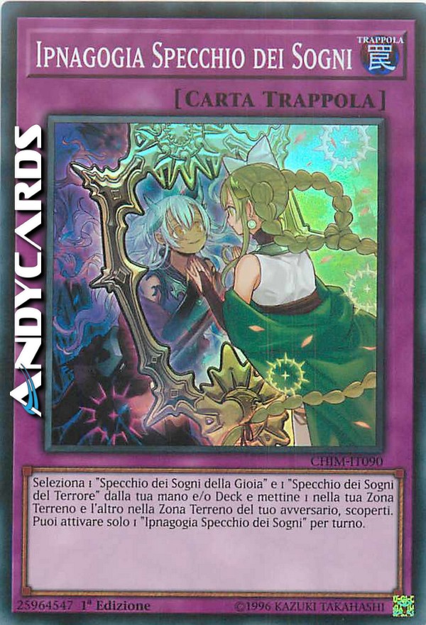 Seleziona 1 "Specchio dei Sogni della Gioia" e 1 "Specchio dei Sogni del Terrore" dalla tua mano e/o Deck e mettine 1 nella tua Zona Terreno e l'altro nella Zona Terreno del tuo avversario, scoperti. Puoi attivare solo 1 "Ipnagogia Specchio dei Sogni" per turno.