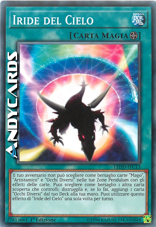 Il tuo avversario non può scegliere come bersaglio carte "Mago", "Artistamico" e "Occhi Diversi" nelle tue Zone Pendulum con gli effetti delle carte. Puoi scegliere come bersaglio 1 altra carta scoperta che controlli; distruggila e, se lo fai, aggiungi 1 carta "Occhi Diversi" dal tuo Deck alla tua mano. Puoi utilizzare questo effetto di "Iride del Cielo" una sola volta per turno.
