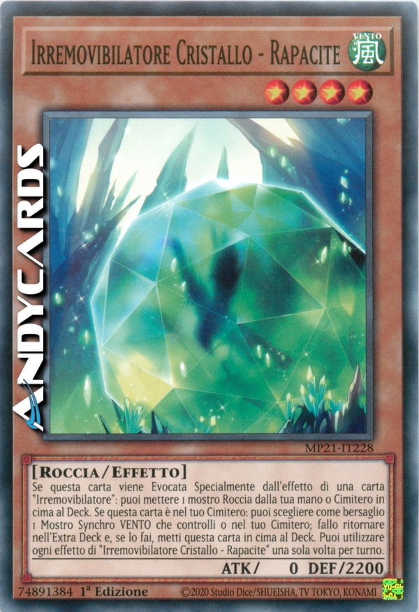 Se questa carta viene Evocata Specialmente dall'effetto di una carta "Irremovibilatore": puoi mettere 1 mostro Roccia dalla tua mano o Cimitero in cima al Deck. Se questa carta è nel tuo Cimitero: puoi scegliere come bersaglio 1 Mostro Synchro VENTO che controlli o nel tuo Cimitero; fallo ritornare nell'Extra Deck e, se lo fai, metti questa carta in cima al Deck. Puoi utilizzare ogni effetto di "Irremovibilatore Cristallo - Rapacite" una sola volta per turno.