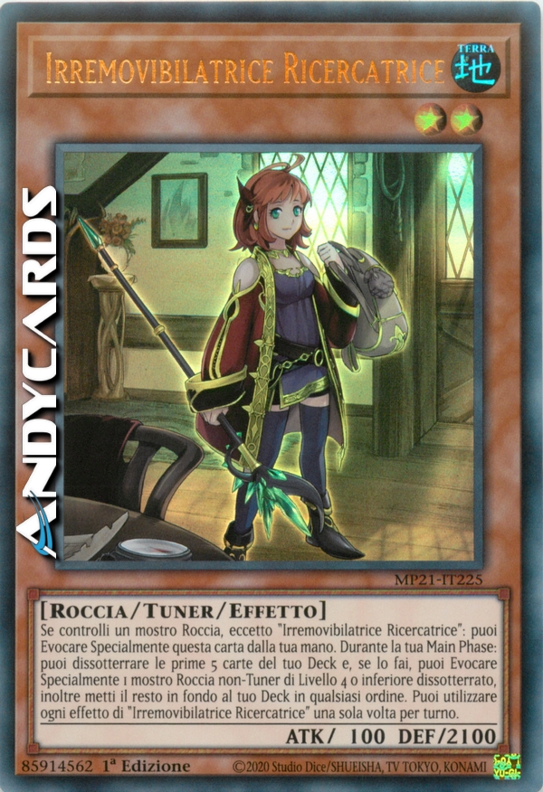 Se controlli un mostro Roccia, eccetto "Irremovibilatrice Ricercatrice": puoi Evocare Specialmente questa carta dalla tua mano. Durante la tua Main Phase: puoi dissotterrare le prime 5 carte del tuo Deck e, se lo fai, puoi Evocare Specialmente 1 mostro Roccia non-Tuner di Livello 4 o inferiore dissotterrato, inoltre metti il resto in fondo al tuo Deck in qualsiasi ordine. Puoi utilizzare ogni effetto di "Irremovibilatrice Ricercatrice" una sola volta per turno.