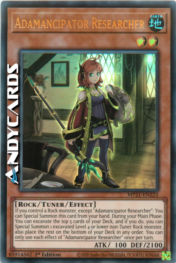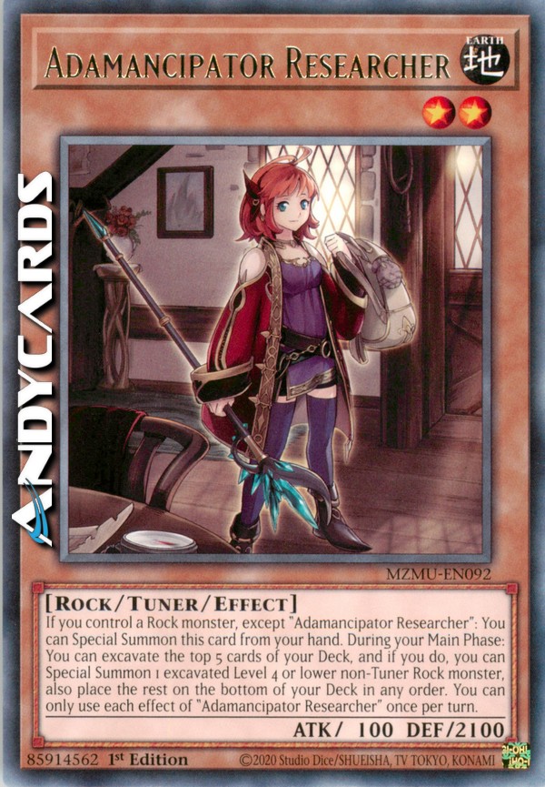 If you control a Rock monster, except "Adamancipator Researcher": You can Special Summon this card from your hand. During your Main Phase: You can excavate the top 5 cards of your Deck, and if you do, you can Special Summon 1 excavated Level 4 or lower non-Tuner Rock monster, also place the rest on the bottom of your Deck in any order. You can only use each effect of "Adamancipator Researcher" once per turn.