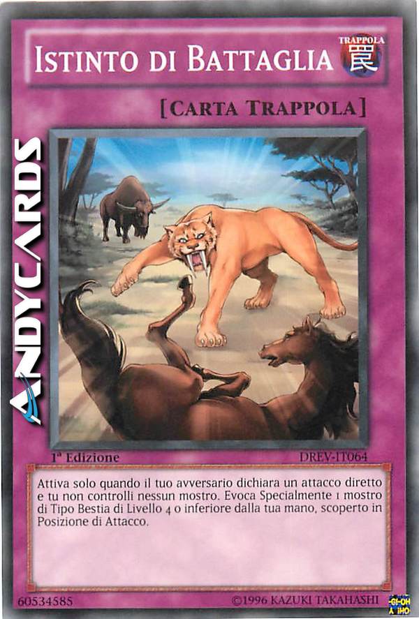 Attiva solo quando il tuo avversario dichiara un attacco diretto e tu non controlli nessun mostro.Evoca specialmente 1 mostro di tipo bestia di livello 4 o inferiore dalla tua mano,scoperto in posizione d'attacco.