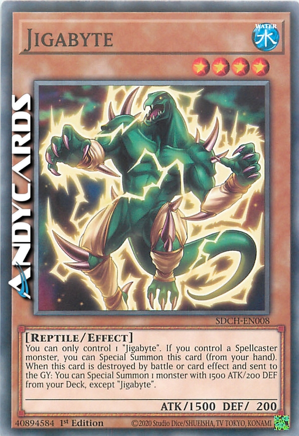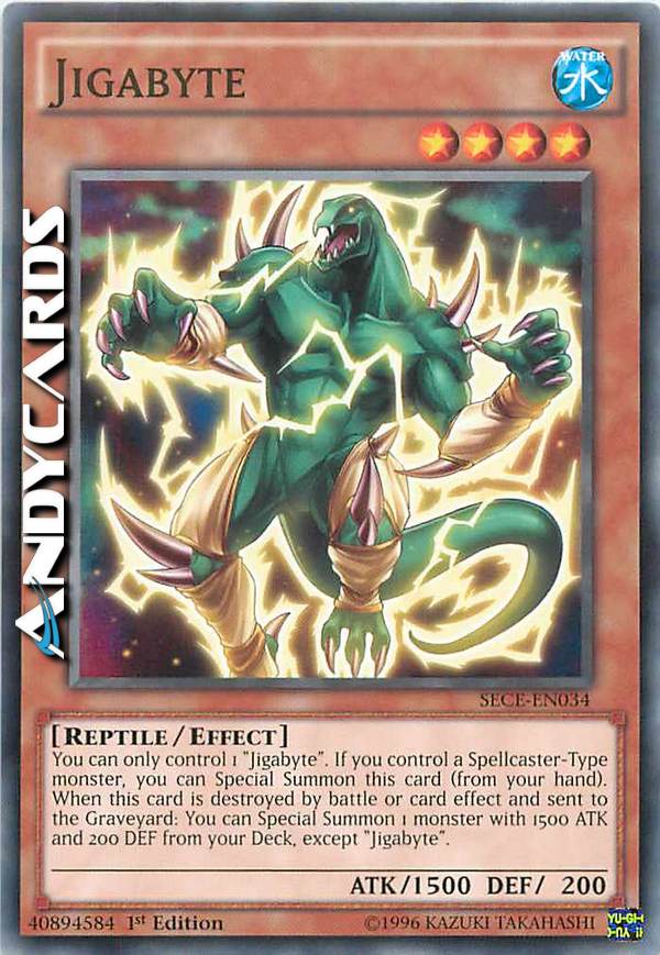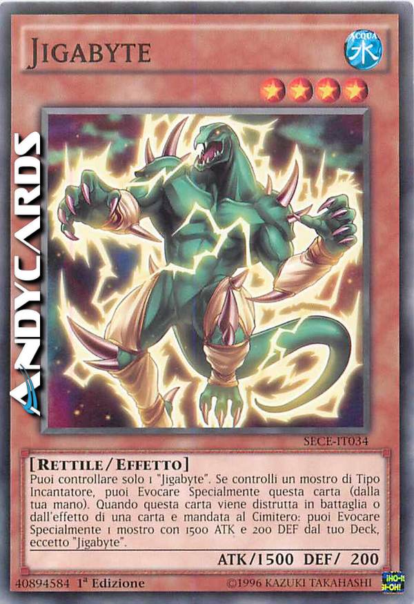 Puoi controllare solo 1 "Jigabyte". Se controlli un mostro di Tipo Incantatore, puoi Evocare Specialmente questa carta (dalla tua mano). Quando questa carta viene distrutta in battaglia o dall'effetto di una carta e mandata al Cimitero: puoi Evocare Specialmente 1 mostro con 1500 ATK e 200 DEF dal tuo Deck, eccetto "Jigabyte".