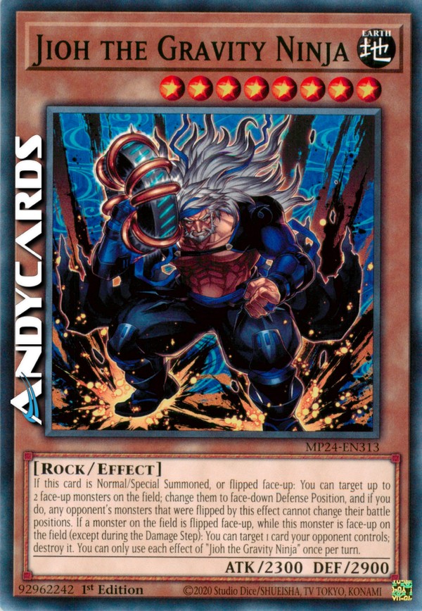 Se questa carta viene Evocata Normalmente/Specialmente, oppure scoperta: puoi scegliere come bersaglio fino a 2 mostri scoperti sul Terreno; mettili coperti in Posizione di Difesa e, se lo fai, qualsiasi mostro dell'avversario che è stato coperto da questo effetto non può cambiare la sua posizione. Se un mostro sul Terreno viene scoperto, mentre questo mostro è scoperto sul Terreno (eccetto durante il Damage Step): puoi scegliere come bersaglio 1 carta controllata dal tuo avversario; distruggila. Puoi utilizzare ogni effetto di "Jioh il Ninja Gravitazionale" una sola volta per turno.