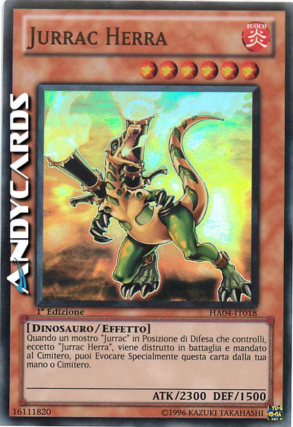 Quando un mostro "Jurrac" in Posizione di Difesa che controlli, eccetto "Jurrac Herra", viene distrutto in battaglia e mandato al Cimitero, puoi Evocare Specialmente questa carta dalla tua mano o Cimitero.