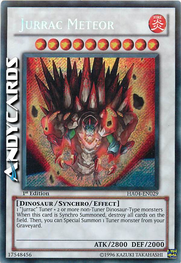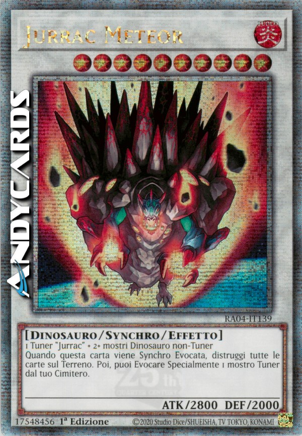 1 Tuner "Jurrac" + 2 o più mostri non-Tuner di Tipo Dinosauro Quando questa carta viene Synchro Evocata, distruggi tutte le carte sul Terreno. Poi, puoi Evocare Specialmente 1 mostro Tuner dal tuo Cimitero.