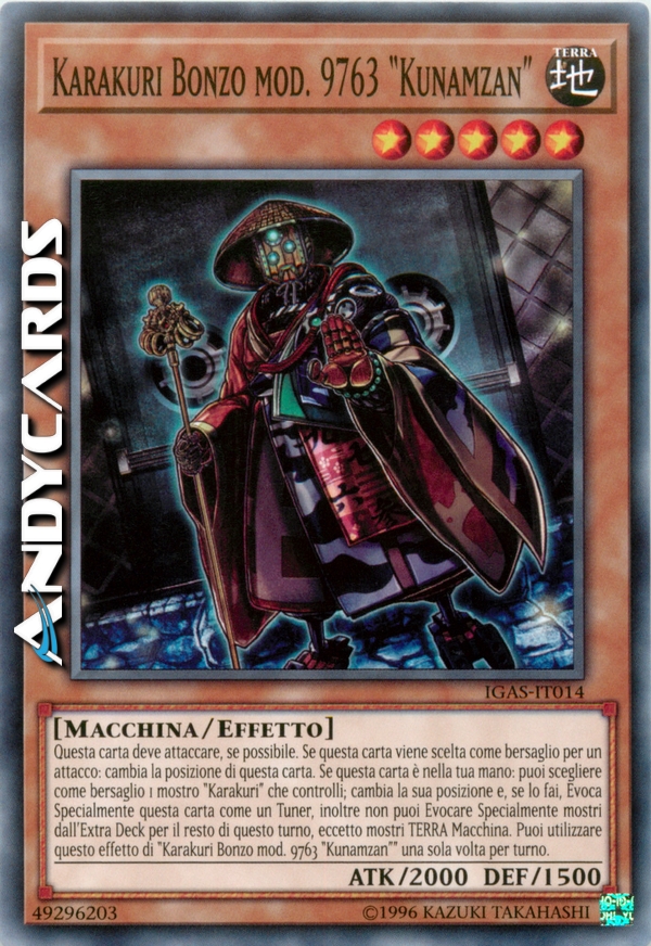 Questa carta deve attaccare, se possibile. Se questa carta viene scelta come bersaglio per un attacco: cambia la posizione di questa carta. Se questa carta è nella tua mano: puoi scegliere come bersaglio 1 mostro "Karakuri" che controlli; cambia la sua posizione e, se lo fai, Evoca Specialmente questa carta come un Tuner, inoltre non puoi Evocare Specialmente mostri dall'Extra Deck per il resto di questo turno, eccetto mostri TERRA Macchina. Puoi utilizzare questo effetto di "Karakuri Bonzo mod. 9763 "Kunamzan"" una sola volta per turno.