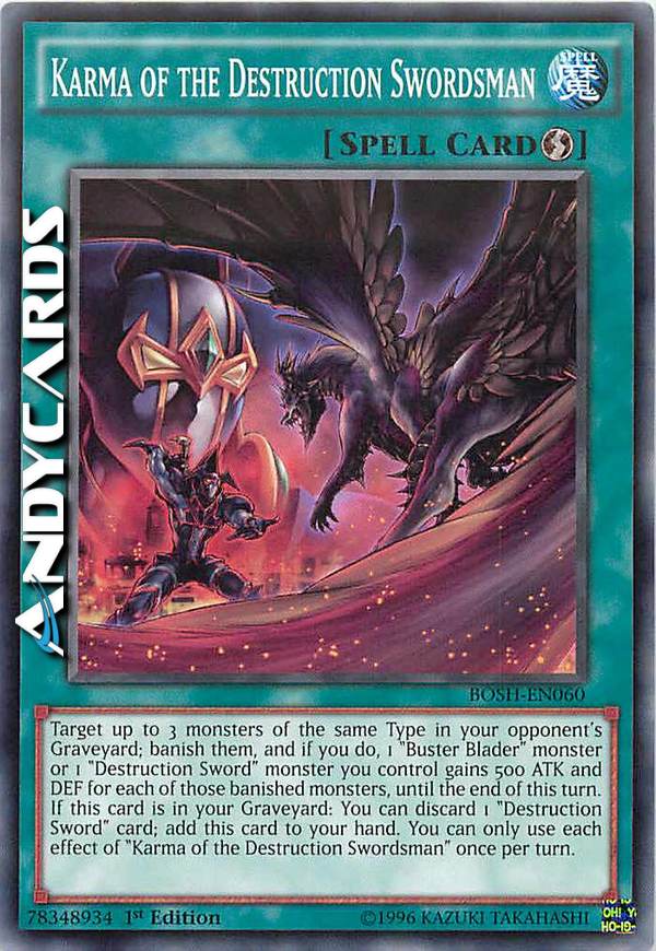 Target up to 3 monsters of the same Type in your opponent's Graveyard; banish them, and if you do, 1 "Buster Blader" monster or 1 "Destruction Sword" monster you control gains 500 ATK and DEF for each of those banished monsters, until the end of this turn. If this card is in your Graveyard: You can discard 1 "Destruction Sword" card; add this card to your hand. You can only use each effect of "Karma of the Destruction Swordsman" once per turn.