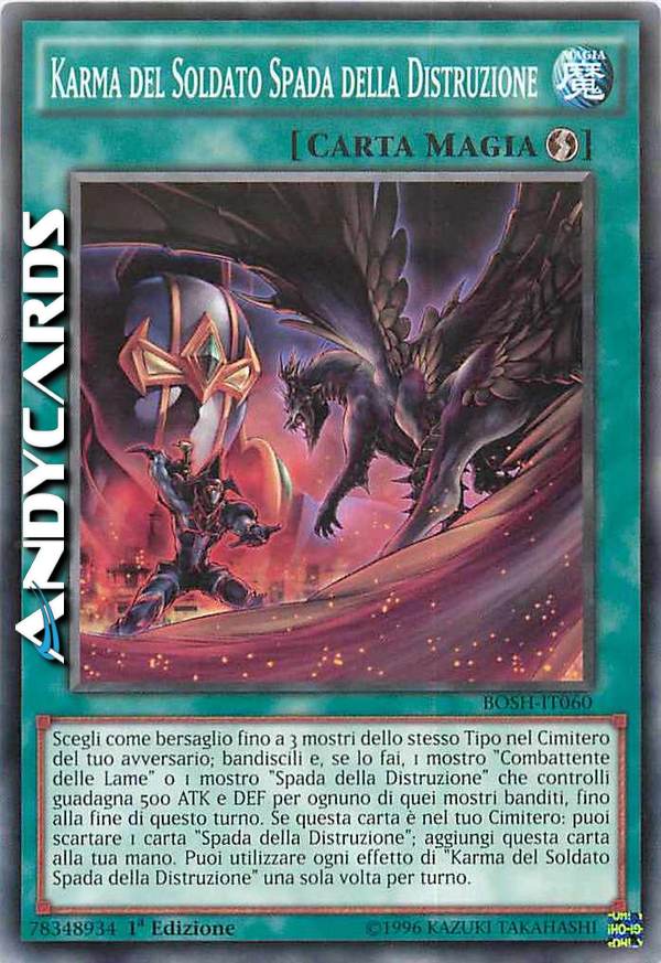 Scegli come bersaglio fino a 3 mostri dello stesso Tipo nel Cimitero del tuo avversario; bandiscili e, se lo fai, 1 mostro "Combattente delle Lame" o 1 mostro "Spada della Distruzione" che controlli guadagna 500 ATK e DEF per ognuno di quei mostri banditi, fino alla fine di questo turno. Se questa carta è nel tuo Cimitero: puoi scartare 1 carta "Spada della Distruzione"; aggiungi questa carta alla tua mano. Puoi utilizzare ogni effetto di "Karma del Soldato Spada della Distruzione" una sola volta per turno.