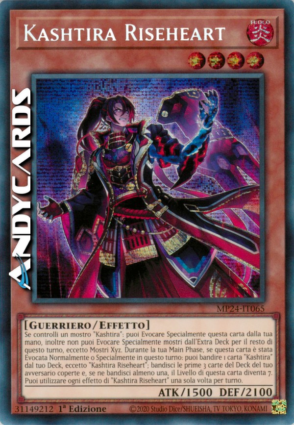 Se controlli un mostro "Kashtira": puoi Evocare Specialmente questa carta dalla tua mano, inoltre non puoi Evocare Specialmente mostri dall'Extra Deck per il resto di questo turno, eccetto Mostri Xyz. Durante la tua Main Phase, se questa carta è stata Evocata Normalmente o Specialmente in questo turno: puoi bandire 1 carta "Kashtira" dal tuo Deck, eccetto "Kashtira Riseheart"; bandisci le prime 3 carte del Deck del tuo avversario coperte e, se ne bandisci almeno una, il Livello di questa carta diventa 7. Puoi utilizzare ogni effetto di "Kashtira Riseheart" una sola volta per turno.