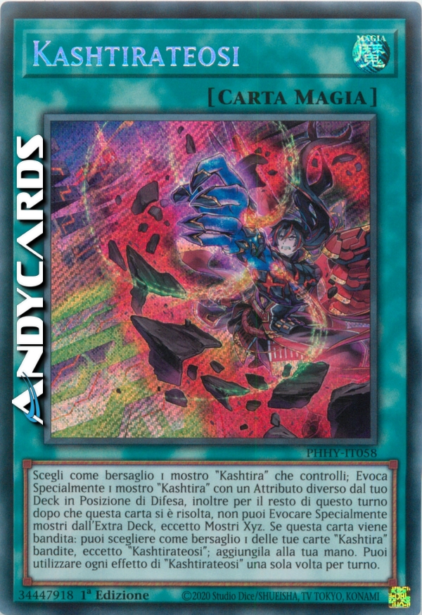 Scegli come bersaglio 1 mostro "Kashtira" che controlli; Evoca Specialmente 1 mostro "Kashtira" con un Attributo diverso dal tuo Deck in Posizione di Difesa, inoltre per il resto di questo turno dopo che questa carta si è risolta, non puoi Evocare Specialmente mostri dall'Extra Deck, eccetto Mostri Xyz. Se questa carta viene bandita: puoi scegliere come bersaglio 1 delle tue carte "Kashtira" bandite, eccetto "Kashtirateosi"; aggiungila alla tua mano. Puoi utilizzare ogni effetto di "Kashtirateosi" una sola volta per turno.