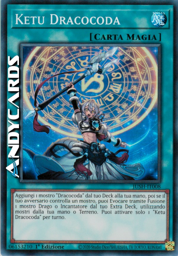 Aggiungi 1 mostro "Dracocoda" dal tuo Deck alla tua mano, poi se il tuo avversario controlla un mostro, puoi Evocare tramite Fusione 1 mostro Drago o Incantatore dal tuo Extra Deck, utilizzando mostri dalla tua mano o Terreno. Puoi attivare solo 1 "Ketu Dracocoda" per turno.