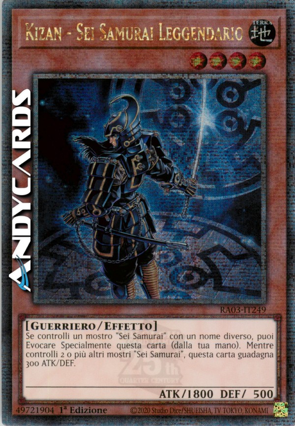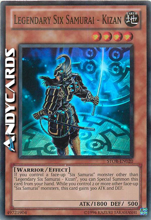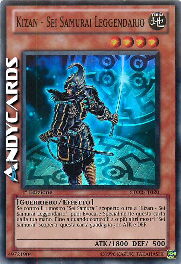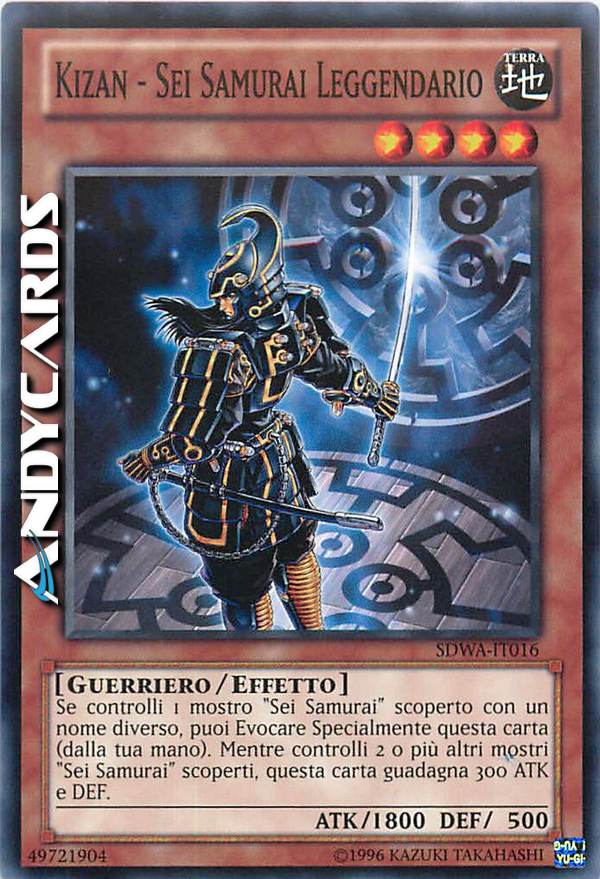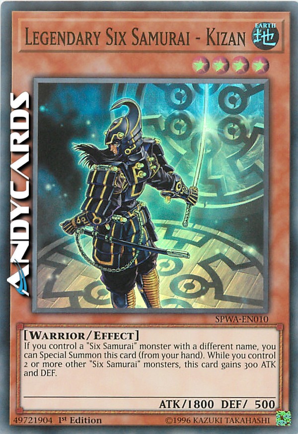 Se controlli un mostro "Sei Samurai" con un nome diverso, puoi Evocare Specialmente questa carta (dalla tua mano). Mentre controlli 2 o più altri mostri "Sei Samurai", questa carta guadagna 300 ATK e DEF.