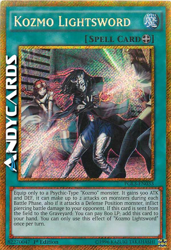 Equip only to a Psychic-Type "Kozmo" monster. It gains 500 ATK and DEF, it can make up to 2 attacks on monsters during each Battle Phase, also if it attacks a Defense Position monster, inflict piercing battle damage to your opponent. If this card is sent from the field to the Graveyard: You can pay 800 LP; add this card to your hand. You can only use this effect of "Kozmo Lightsword" once per turn.