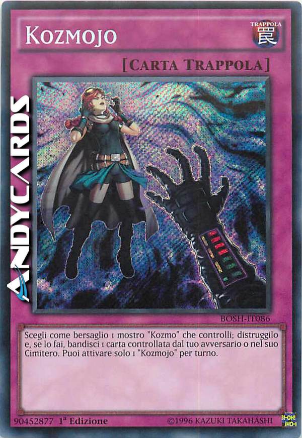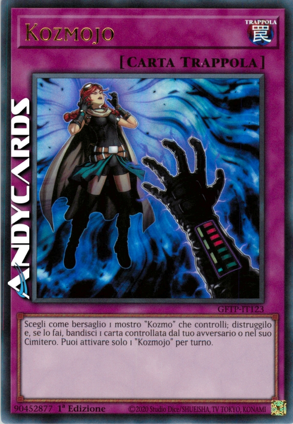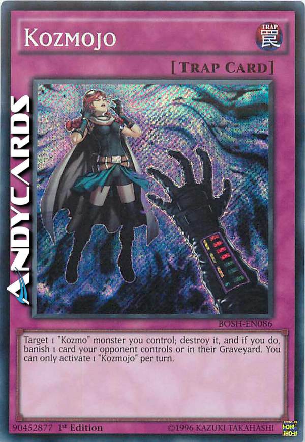 Scegli come bersaglio 1 mostro "Kozmo" che controlli; distruggilo e, se lo fai, bandisci 1 carta controllata dal tuo avversario o nel suo Cimitero. Puoi attivare solo 1 "Kozmojo" per turno.