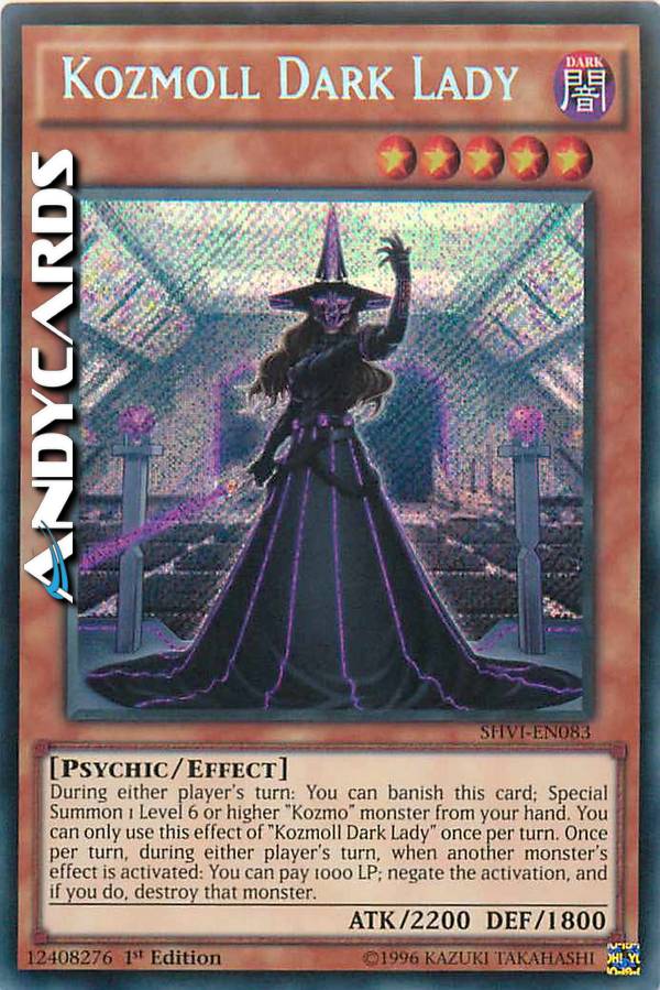 During either player's turn: You can banish this card; Special Summon 1 Level 6 or higher "Kozmo" monster from your hand. You can only use this effect of "Kozmoll Dark Lady" once per turn. Once per turn, during either player's turn, when another monster's effect is activated: You can pay 1000 LP; negate the activation, and if you do, destroy that monster.