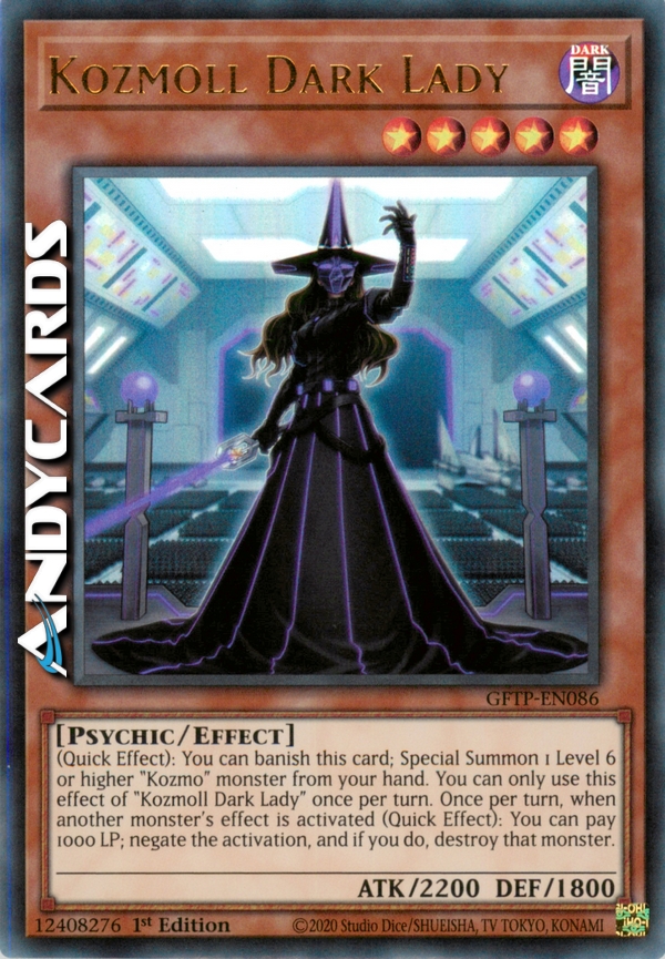 (Questa carta non viene considerata come una carta "Signore Oscuro".) Durante il turno di qualsiasi giocatore: puoi bandire questa carta; Evoca Specialmente 1 mostro "Kozmo" di Livello 6 o superiore dalla tua mano. Puoi utilizzare questo effetto di "Kozmoll Signora Oscura" una sola volta per turno. Una volta per turno, durante il turno di qualsiasi giocatore, quando viene attivato l'effetto di un altro mostro: puoi pagare 1000 LP; annulla l'attivazione e, se lo fai, distruggi quel mostro.