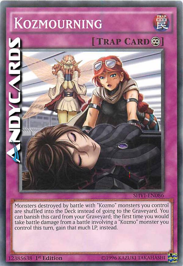 I mostri distrutti in battaglia con i mostri "Kozmo" che controlli vengono mischiati nel Deck invece di andare al Cimitero. Puoi bandire questa carta dal tuo Cimitero; la prima volta che stai per subire danno da combattimento da una battaglia che coinvolge un mostro "Kozmo" che controlli in questo turno, guadagna invece quei LP.