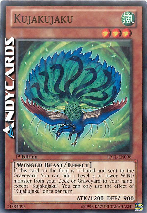 If this card on the field is Tributed and sent to the Graveyard: You can add 1 Level 4 or lower WIND monster from your Deck or Graveyard to your hand, except "Kujakujaku". You can only use the effect of "Kujakujaku" once per turn.