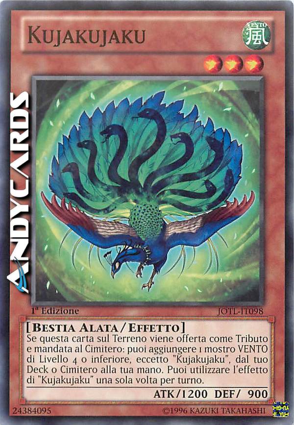 Se questa carta sul Terreno viene offerta come Tributo e mandata al Cimitero: puoi aggiungere 1 mostro VENTO di Livello 4 o inferiore, eccetto "Kajakujaku", dal tuo Deck o Cimitero alla tua mano. Puoi utilizzare l'effetto di "Kajakujaku" una sola volta per turno.