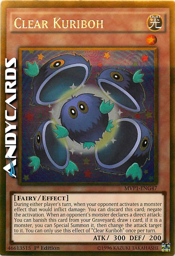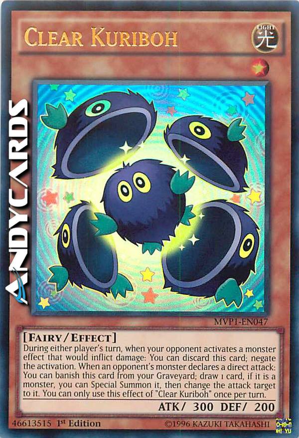 During either player's turn, when your opponent activates a monster effect that would inflict damage: You can discard this card; negate the activation. When an opponent's monster declares a direct attack: You can banish this card from your Graveyard; draw 1 card, if it is a monster, you can Special Summon it, then change the attack target to it. You can only use this effect of "Clear Kuriboh" once per turn.