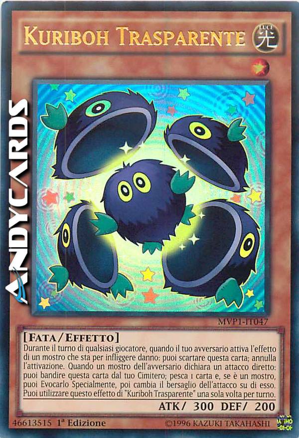 Durante il turno di qualsiasi giocatore, quando il tuo avversario attiva l'effetto di un mostro che sta per infliggere danno: puoi scartare questa carta; annulla l'attivazione. Quando un mostro dell'avversario dichiara un attacco diretto: puoi bandire questa carta dal tuo Cimitero; pesca 1 carta e, se è un mostro, puoi Evocarlo Specialmente, poi cambia il bersaglio dell'attacco su di esso. Puoi utilizzare questo effetto di "Kuriboh Trasparente" una sola volta per turno.