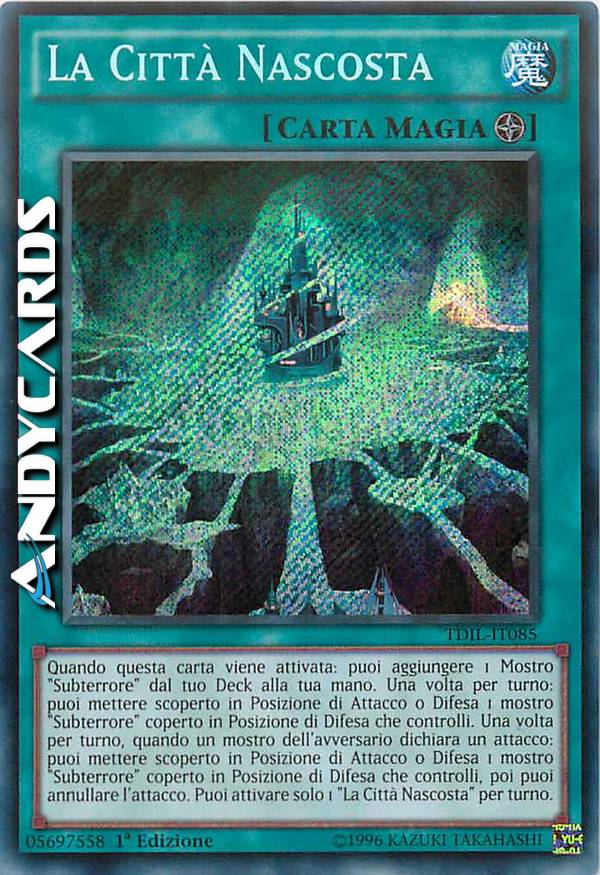 Quando questa carta viene attivata: puoi aggiungere 1 Mostro "Subterrore" dal tuo Deck alla tua mano. Una volta per turno: puoi mettere scoperto in Posizione di Attacco o Difesa 1 mostro "Subterrore" coperto in Posizione di Difesa che controlli. Una volta per turno, quando un mostro dell'avversario dichiara un attacco: puoi mettere scoperto in Posizione di Attacco o Difesa 1 mostro "Subterrore" coperto in Posizione di Difesa che controlli, poi puoi annullare l'attacco. Puoi attivare solo 1 "La Città Nascosta" per turno.