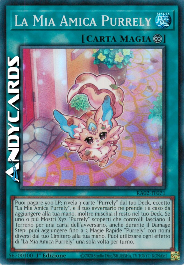 Puoi pagare 500 LP; rivela 3 carte "Purrely" dal tuo Deck, eccetto "La Mia Amica Purrely", e il tuo avversario ne prende 1 a caso da aggiungere alla tua mano, inoltre mischia il resto nel tuo Deck. Se uno o più Mostri Xyz "Purrely" scoperti che controlli lasciano il Terreno per una carta dell'avversario, anche durante il Damage Step: puoi aggiungere fino a 3 Magie Rapide "Purrely" con nomi diversi dal tuo Cimitero alla tua mano. Puoi utilizzare ogni effetto di "La Mia Amica Purrely" una sola volta per turno.