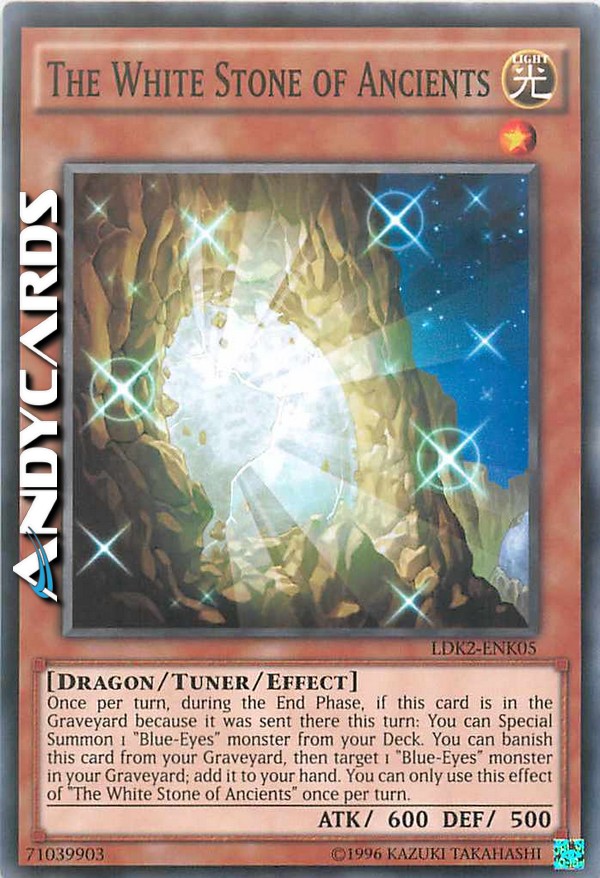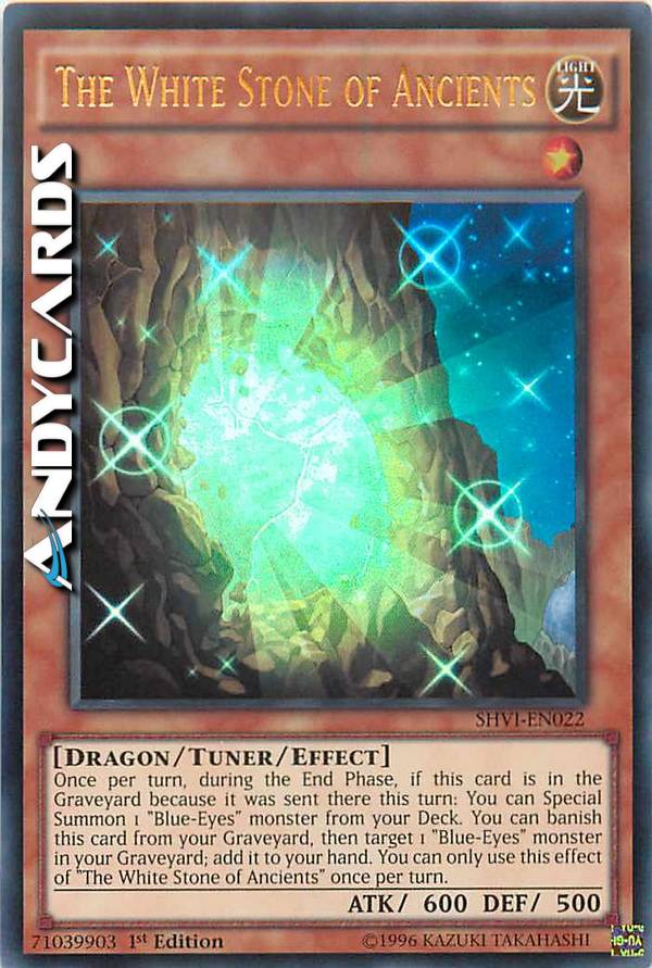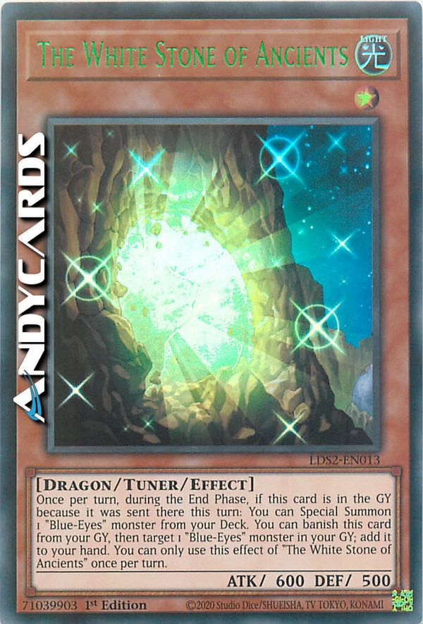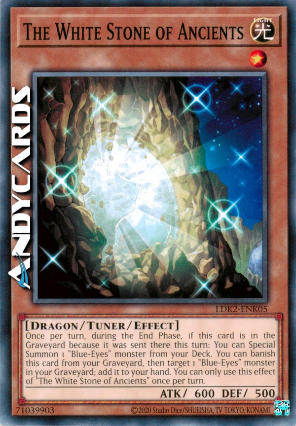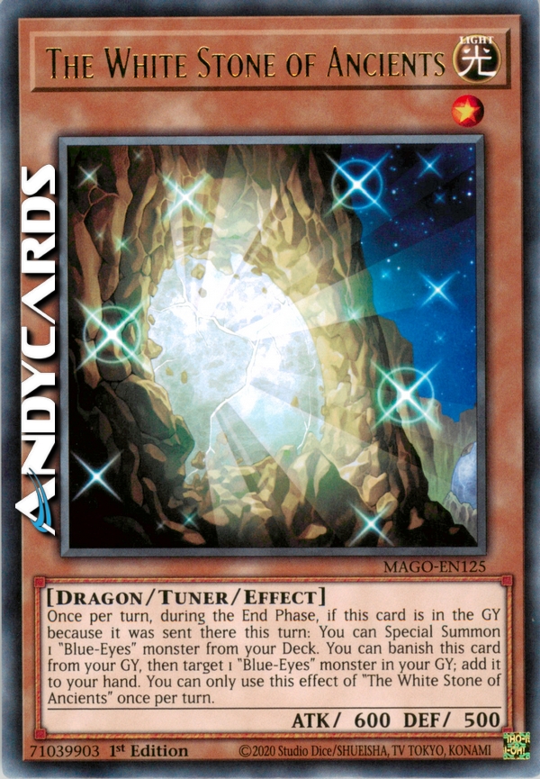 Once per turn, during the End Phase, if this card is in the GY because it was sent there this turn: You can Special Summon 1 "Blue-Eyes" monster from your Deck. You can banish this card from your GY, then target 1 "Blue-Eyes" monster in your GY; add it to your hand. You can only use this effect of "The White Stone of Ancients" once per turn.