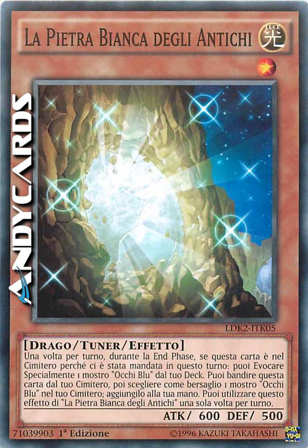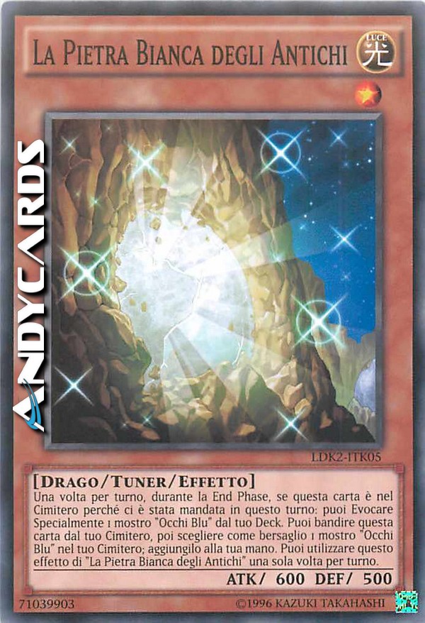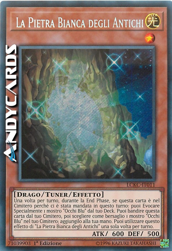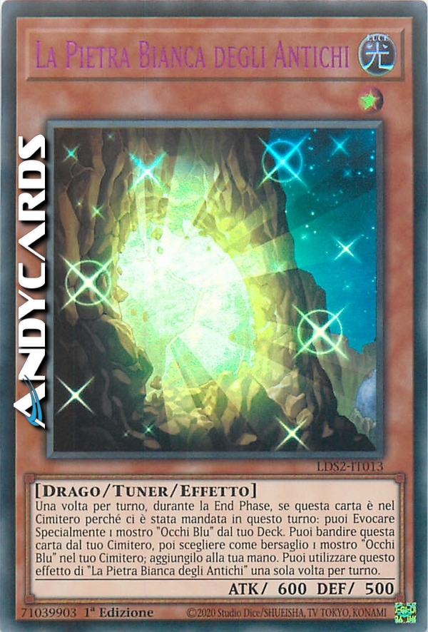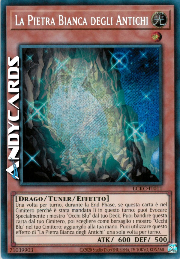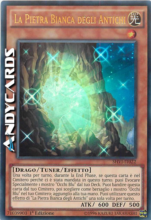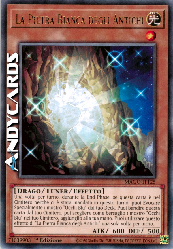 Una volta per turno, durante la End Phase, se questa carta è nel Cimitero perché ci è stata mandata in questo turno: puoi Evocare Specialmente 1 mostro "Occhi Blu" dal tuo Deck. Puoi bandire questa carta dal tuo Cimitero, poi scegliere come bersaglio 1 mostro "Occhi Blu" nel tuo Cimitero; aggiungilo alla tua mano. Puoi utilizzare questo effetto di "La Pietra Bianca degli Antichi" una sola volta per turno.