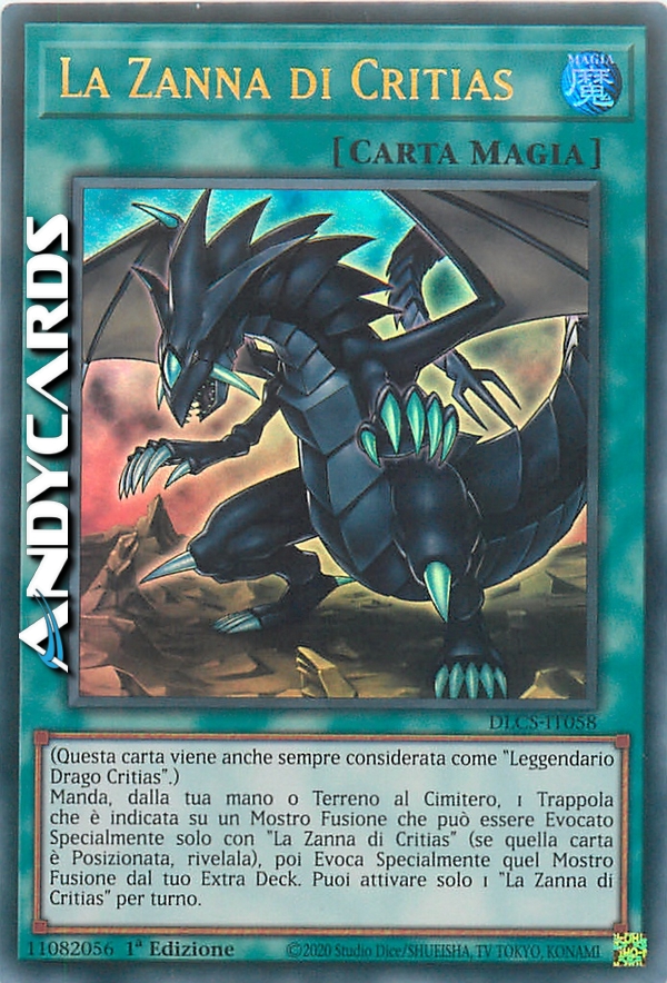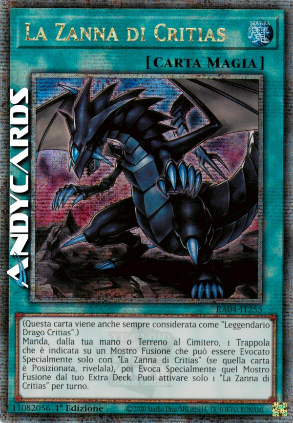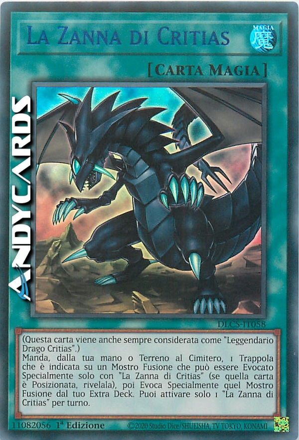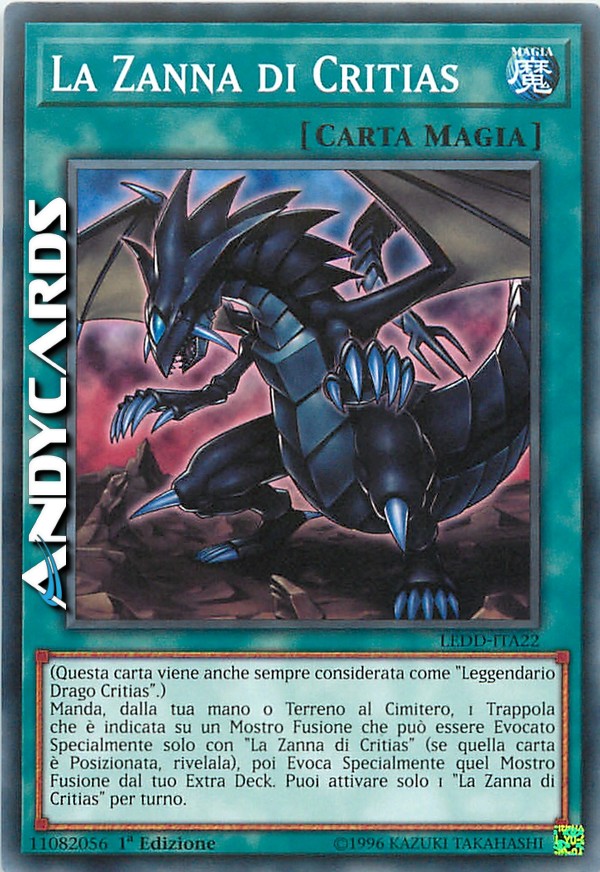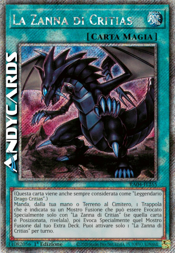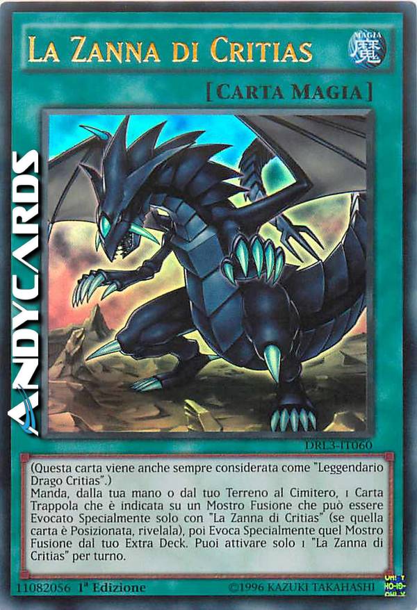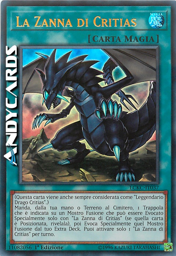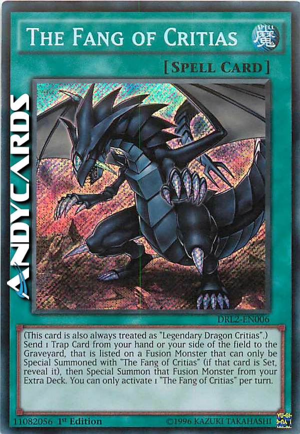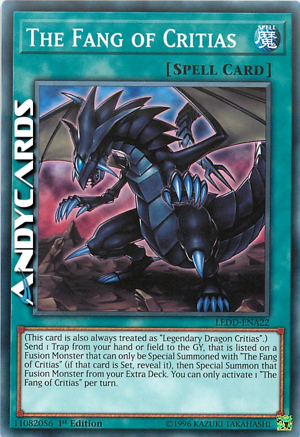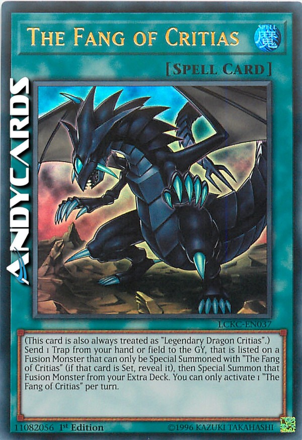 (Questa carta viene anche sempre considerata come "Leggendario Drago Critias".) Manda, dalla tua mano o Terreno al Cimitero, 1 Trappola che è indicata su un Mostro Fusione che può essere Evocato Specialmente solo con "La Zanna di Critias" (se quella carta è Posizionata, rivelala), poi Evoca Specialmente quel Mostro Fusione dal tuo Extra Deck. Puoi attivare solo 1 "La Zanna di Critias" per turno.
