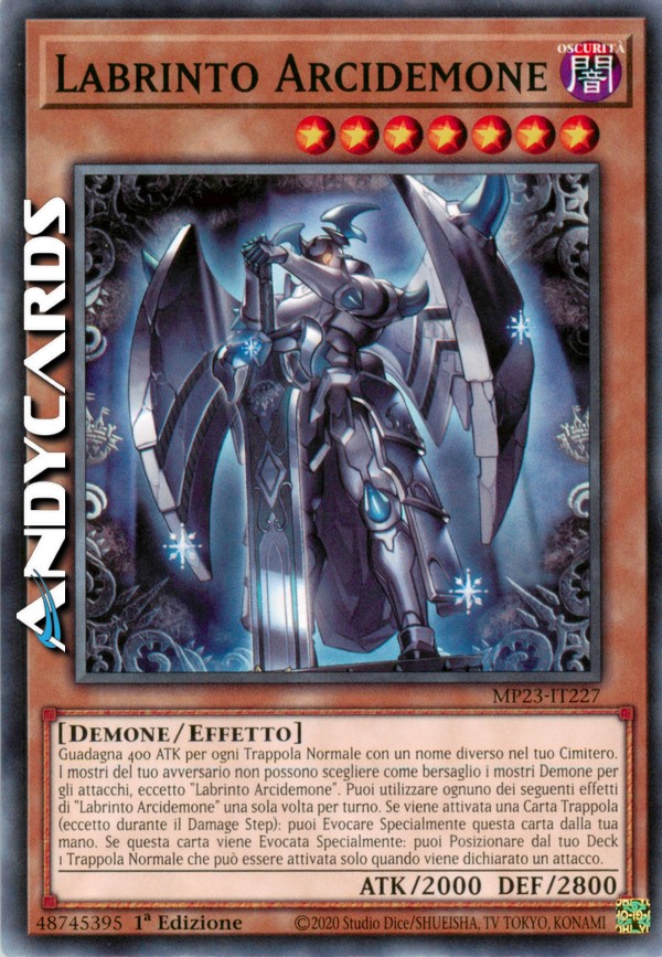 Guadagna 400 ATK per ogni Trappola Normale con un nome diverso nel tuo Cimitero. I mostri del tuo avversario non possono scegliere come bersaglio i mostri Demone per gli attacchi, eccetto "Labrinto Arcidemone". Puoi utilizzare ognuno dei seguenti effetti di "Labrinto Arcidemone" una sola volta per turno. Se viene attivata una Carta Trappola (eccetto durante il Damage Step): puoi Evocare Specialmente questa carta dalla tua mano. Se questa carta viene Evocata Specialmente: puoi Posizionare dal tuo Deck 1 Trappola Normale che può essere attivata solo quando viene dichiarato un attacco.