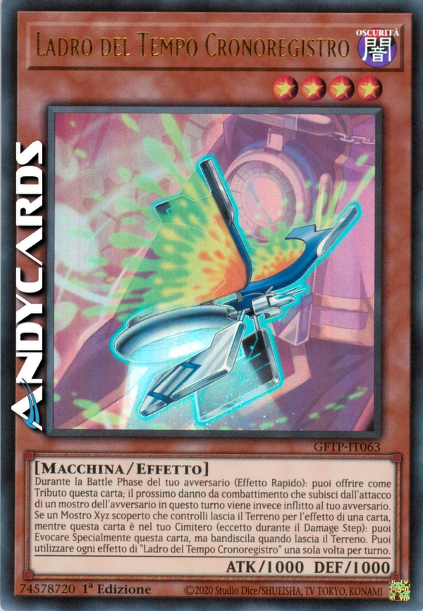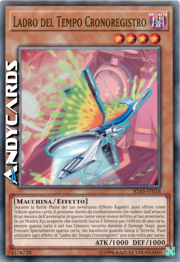 Durante la Battle Phase del tuo avversario (Effetto Rapido): puoi offrire come Tributo questa carta; il prossimo danno da combattimento che subisci dall'attacco di un mostro dell'avversario in questo turno viene invece inflitto al tuo avversario. Se un Mostro Xyz scoperto che controlli lascia il Terreno per l'effetto di una carta, mentre questa carta è nel tuo Cimitero (eccetto durante il Damage Step): puoi Evocare Specialmente questa carta, ma bandiscila quando lascia il Terreno. Puoi utilizzare ogni effetto di "Ladro del Tempo Cronoregistro" una sola volta per turno.