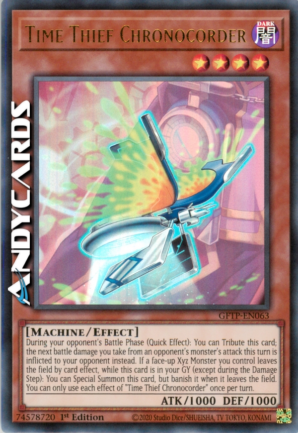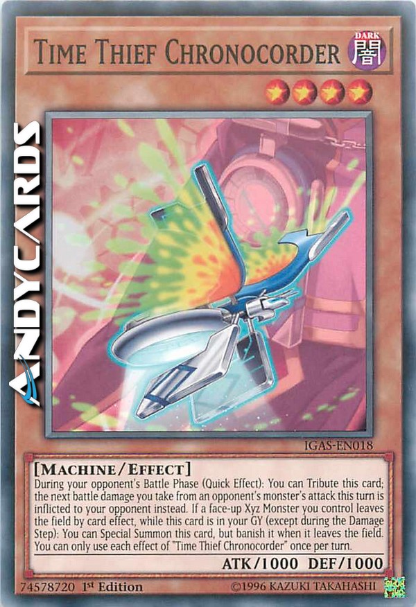 During your opponent's Battle Phase (Quick Effect): You can Tribute this card; the next battle damage you take from an opponent's monster's attack this turn is inflicted to your opponent instead. If a face-up Xyz Monster you control leaves the field by card effect, while this card is in your GY (except during the Damage Step): You can Special Summon this card, but banish it when it leaves the field. You can only use each effect of "Time Thief Chronocorder" once per turn.