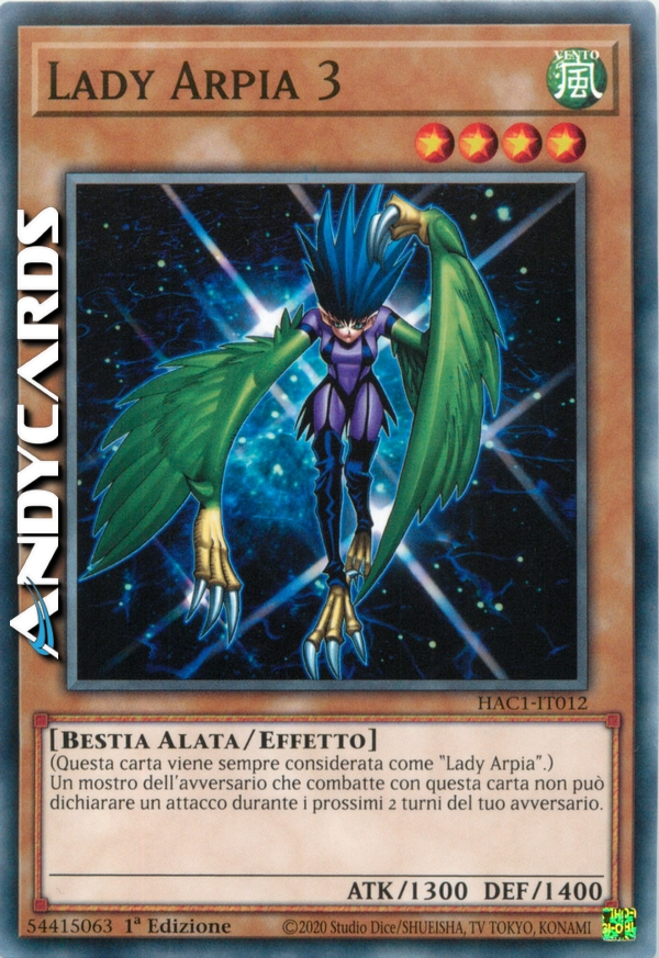 Il nome di questa carta è considerato "Lady Arpia". I mostri del tuo avversario che combattono con questa carta non possono dichiarare un attacco per i prossimi 2 turni del tuo avversario.