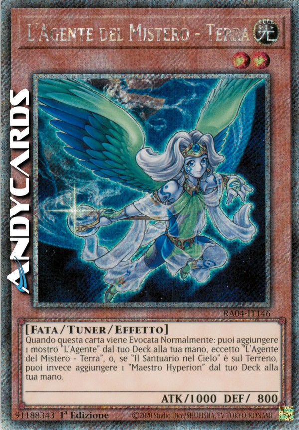 Quando questa carta viene Evocata Normalmente, puoi aggiungere 1 mostro "L'Agente" dal tuo Deck alla tua mano, eccetto "L'Agente del Mistero - Terra". Mentre "Il Santuario nel Cielo" è scoperto sul Terreno, puoi invece aggiungere 1 "Maestro Hyperion" dal tuo Deck alla tua Mano.