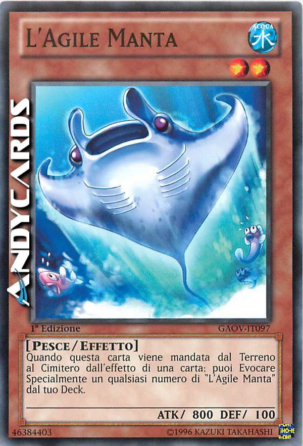 Quando questa carta viene mandata dal Terreno al Cimitero dall'effetto di una carta: puoi Evocare Specialmente un qualsiasi numero di "L'Agile Manta" dal tuo Deck.
