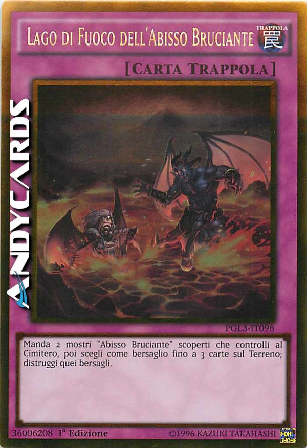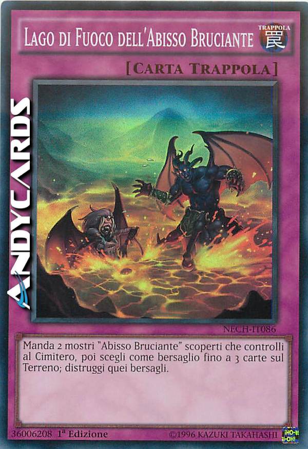 Manda 2 mostri "Abisso Bruciante" scoperti che controlli al Cimitero, poi scegli come bersaglio fino a 3 carte sul Terreno; distruggi quei bersagli.