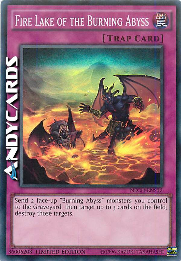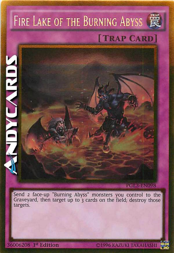 Manda 2 mostri "Abisso Bruciante" scoperti che controlli al Cimitero, poi scegli come bersaglio fino 3 carte sul Terreno; distruggi quei bersagli.