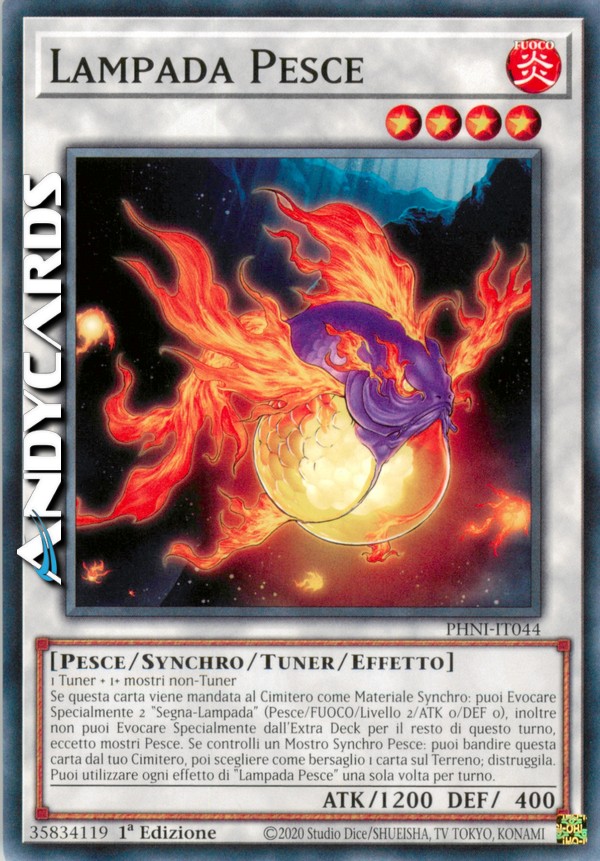 Se questa carta viene mandata al Cimitero come Materiale Synchro: puoi Evocare Specialmente 2 "Segna-Lampada" (Pesce/FUOCO/Livello 2/ATK 0/DEF 0), inoltre non puoi Evocare Specialmente dall'Extra Deck per il resto di questo turno, eccetto mostri Pesce. Se controlli un Mostro Synchro Pesce: puoi bandire questa carta dal tuo Cimitero, poi scegliere come bersaglio 1 carta sul Terreno; distruggila. Puoi utilizzare ogni effetto di "Lampada Pesce" una sola volta per turno.