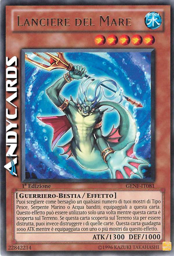 Puoi scegliere come bersaglio un qualsiasi numero di tuoi mostri di Tipo Pesce, Serpente Marino o Acqua banditi; equipaggiali a questa carta. Questo effetto può essere utilizzato solo una volta mentre questa carta è scoperta sul Terreno. Se questa carta scoperta sul Terreno sta per essere distrutta, puoi invece distruggere 1 di quelle carte. Questa carta guadagna 1000 ATK mentre è equipaggiata con uno o più mostri da questo effetto.