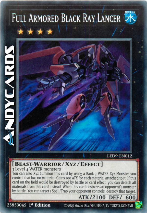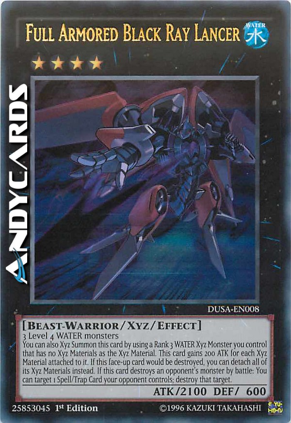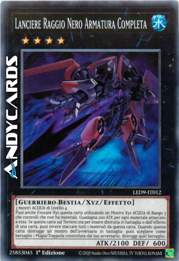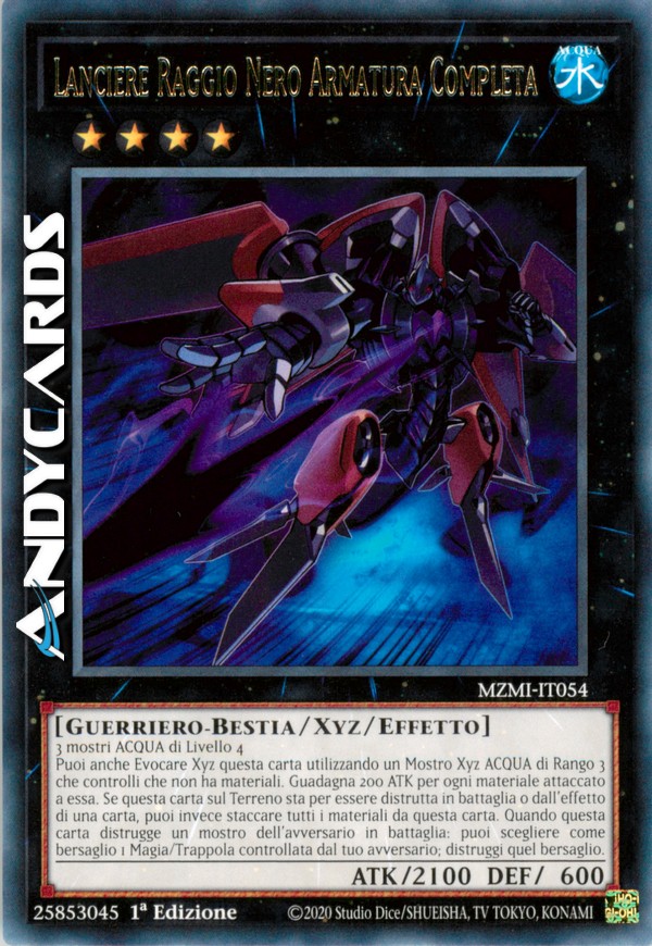 Puoi anche Evocare Xyz questa carta utilizzando come Materiale Xyz un Mostro Xyz ACQUA di Rango 3 che controlli che non ha Materiali Xyz. Questa carta guadagna 200 ATK per ogni Materiale Xyz attaccato ad essa. Se questa carta scoperta sta per essere distrutta, puoi invece staccare tutti i suoi Materiali Xyz. Se questa carta distrugge un mostro dell'avversario in battaglia: puoi scegliere come bersaglio 1 Carta Magia/Trappola controllata dal tuo avversario; distruggi quel bersaglio.