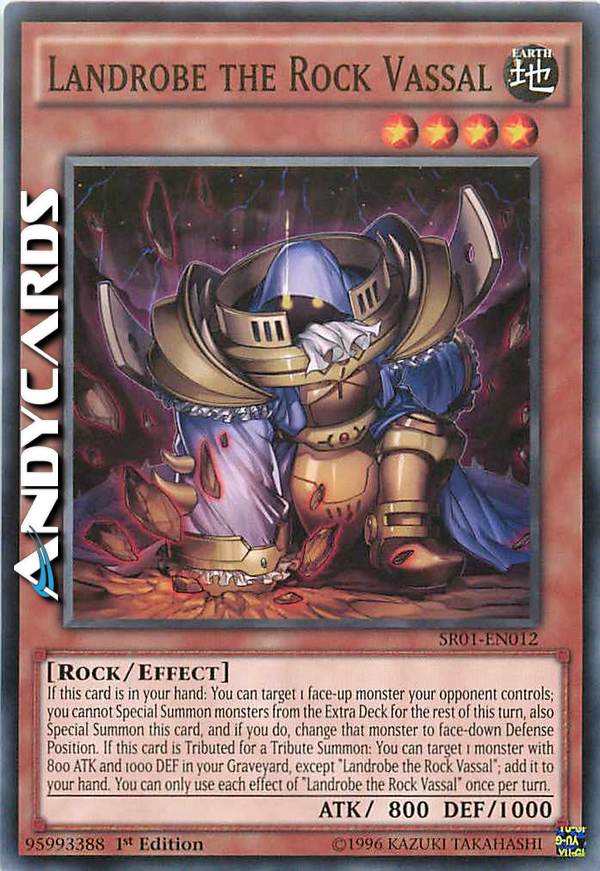 If this card is in your hand: You can target 1 face-up monster your opponent controls; you cannot Special Summon monsters from the Extra Deck for the rest of this turn, also Special Summon this card, and if you do, change that monster to face-down Defense Position. If this card is Tributed for a Tribute Summon: You can target 1 monster with 800 ATK and 1000 DEF in your Graveyard, except "Landrobe the Rock Vassal"; add it to your hand. You can only use each effect of "Landrobe the Rock Vassal" once per turn.