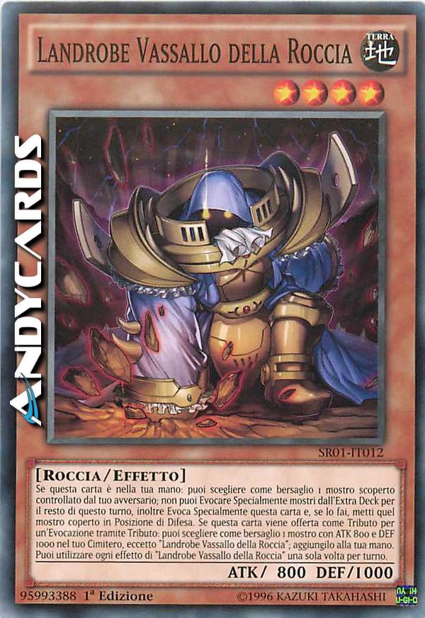 Se questa carta è nella tua mano: puoi scegliere come bersaglio 1 mostro scoperto controllato dal tuo avversario; non puoi Evocare Specialmente mostri dall'Extra Deck per il resto di questo turno, inoltre Evoca Specialmente questa carta e, se lo fai, metti quel mostro coperto in Posizione di Difesa. Se questa carta viene offerta come Tributo per un'Evocazione tramite Tributo: puoi scegliere come bersaglio 1 mostro con ATK 800 e DEF 1000 nel tuo Cimitero, eccetto "Landrobe Vassallo della Roccia"; aggiungilo alla tua mano. Puoi utilizzare ogni effetto di "Landrobe Vassallo della Roccia" una sola volta per turno.