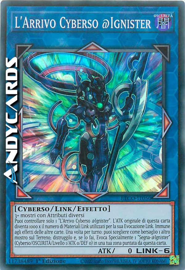 Puoi controllare solo 1 "L'Arrivo Cyberso @Ignister". L'ATK originale di questa carta diventa 1000 x il numero di Materiali Link utilizzati per la sua Evocazione Link. Immune agli effetti delle altre carte. Una volta per turno: puoi scegliere come bersaglio 1 altro mostro sul Terreno; distruggilo e, se lo fai, Evoca Specialmente 1 "Segna-@Ignister" (Cyberso/OSCURITÀ/Livello 1/ATK 0/DEF 0) in una tua zona puntata da questa carta.