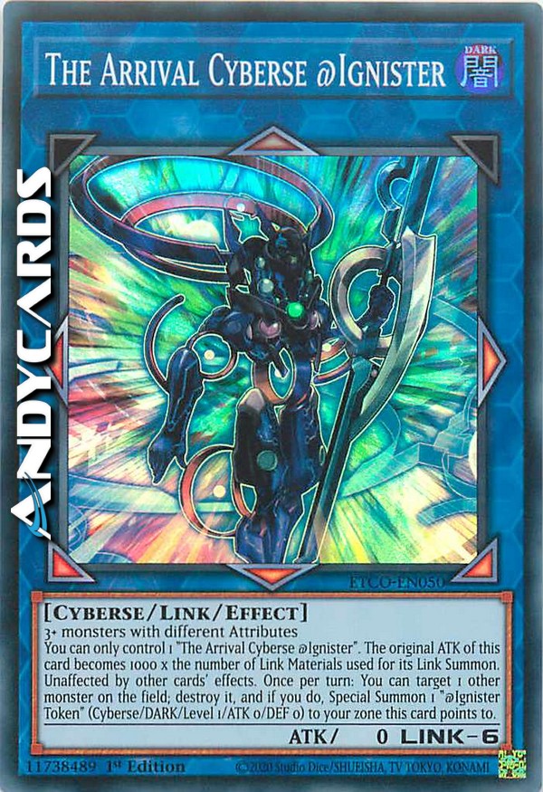 You can only control 1 "The Arrival Cyberse @Ignister". The original ATK of this card becomes 1000 x the number of Link Materials used for its Link Summon. Unaffected by other cards' effects. Once per turn: You can target 1 other monster on the field; destroy it, and if you do, Special Summon 1 "@Ignister Token" (Cyberse/DARK/Level 1/ATK 0/DEF 0) to your zone this card points to.